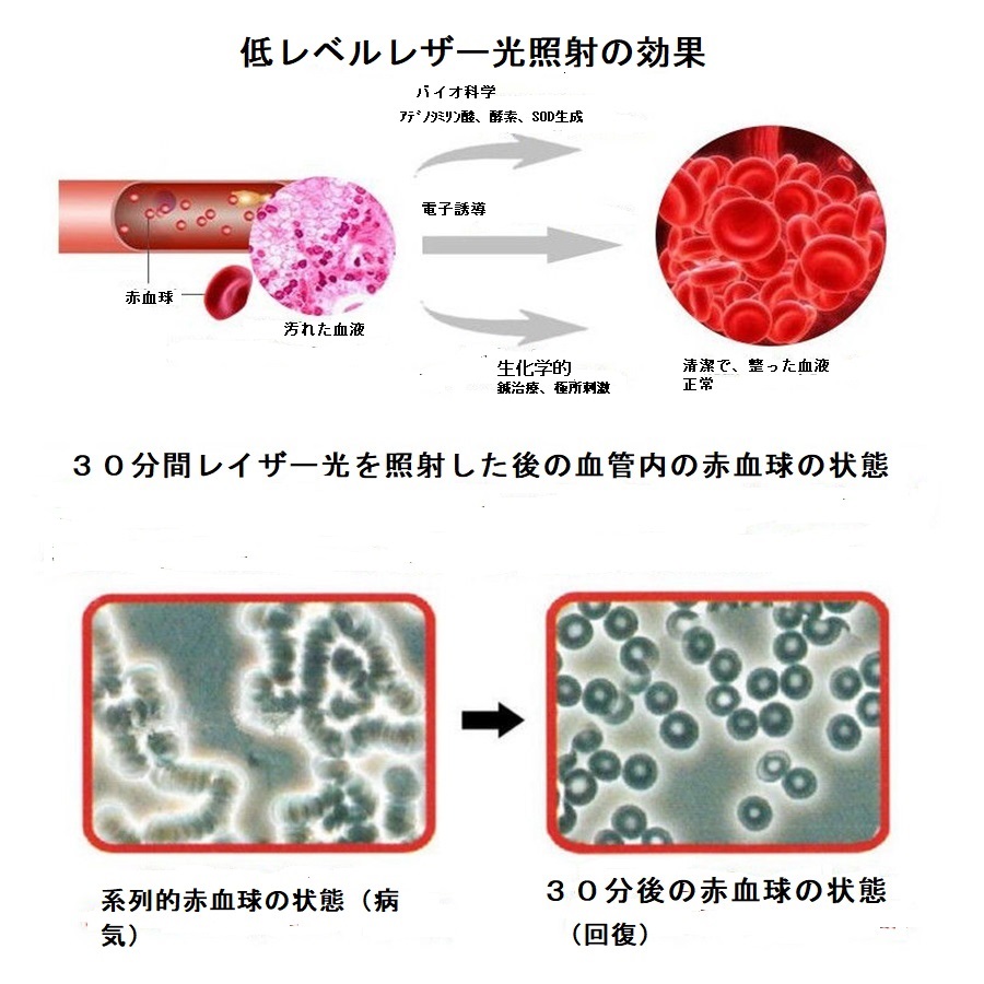 身体の血管に光レザーを与え、バイオケミカル的効果を発生させ、ドロドロの血液がサラサラになり、高脂肪、高血圧、糖尿病などの現代病に対し効果が高いと期待されております。血液を整えることから、心臓や血管の病に効果があります。心血管症(CVD),虚血性心疾患にも良い効果が期待されております。